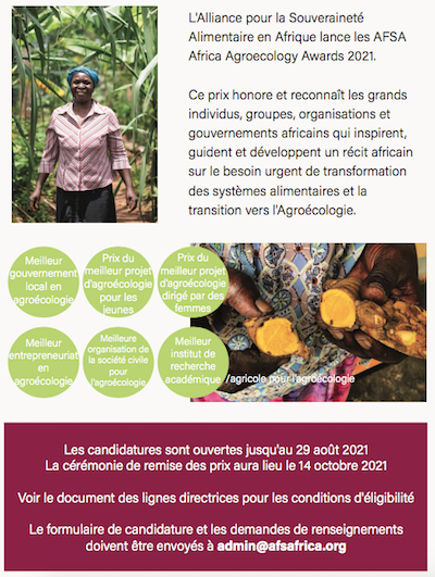 L’Alliance pour la Souveraineté Alimentaire en Afrique lance les AFSA Africa Agroecology Awards 2021. Ce prix honore et reconnaît les grands individus, groupes, organisations et gouvernements africains qui inspirent, guident et développent un récit africain sur le besoin urgent de transformation des systèmes alimentaires et la transition vers l’Agroécologie.